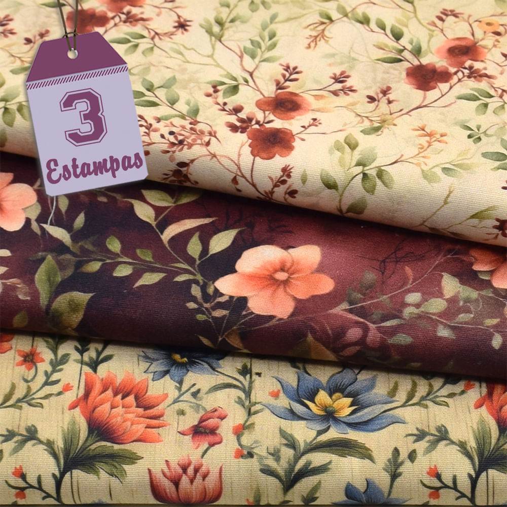 Kit de Tecido Floral com Ramos (50x150) 3 Estampas