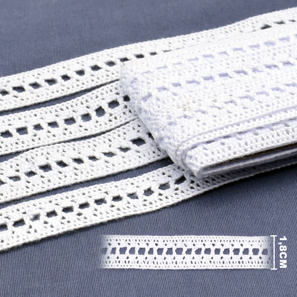Muito usada em projetos de costura criativa, lembrancinhas, decoração de peças infantis, cartonagem e convites, essa renda se destaca pela leveza e versatilidade. O branco combina com uma grande variedade de cores e tecidos, e o algodão proporciona manuseio fácil e ótimo acabamento mesmo em trabalhos mais delicados.