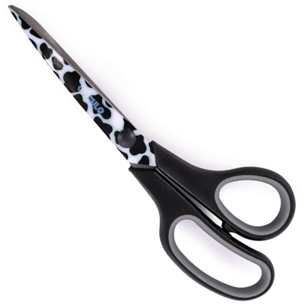 Ideal para cortes precisos em tecidos, papéis e materiais de artesanato, a Tesoura Comfort Estampada une funcionalidade com um toque de criatividade. Seu design de 21,5 cm traz lâminas em aço com acabamento estampado em manchas preto e branco, que adiciona um charme especial à sua rotina de criação.