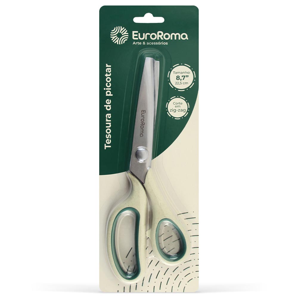 aTesoura de Picotar EuroRoma Verde Musgo ideal para cortes decorativos em tecidos e papéis, proporcionando acabamento diferenciado com efeito em zig-zag. Perfeita para trabalhos de costura, patchwork e artesanato, ajudando a evitar o desfiamento do tecido.